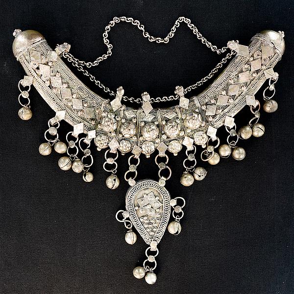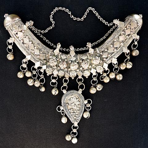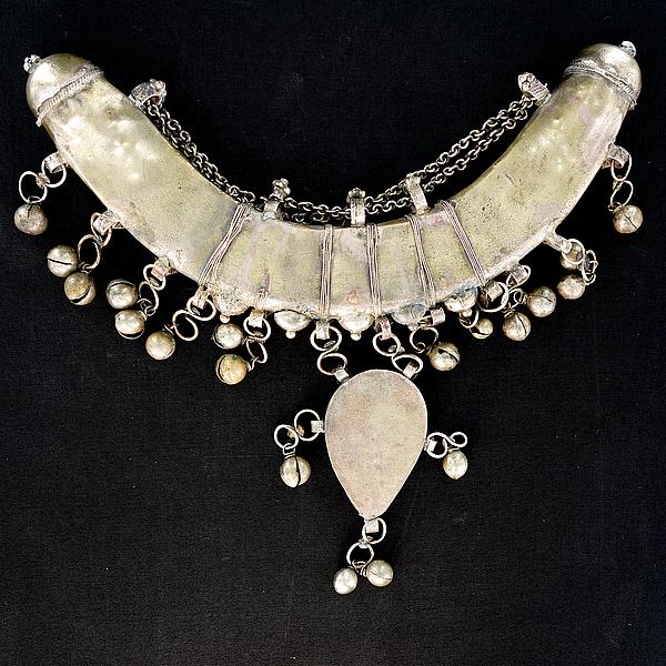 Silver crescent wedding necklaces such as this were traditionally worn long ago, and are associated with the rural areas around Harar, Somalia and Yemen. In fair condition, some bells may have been lost and replaced (see pict.)