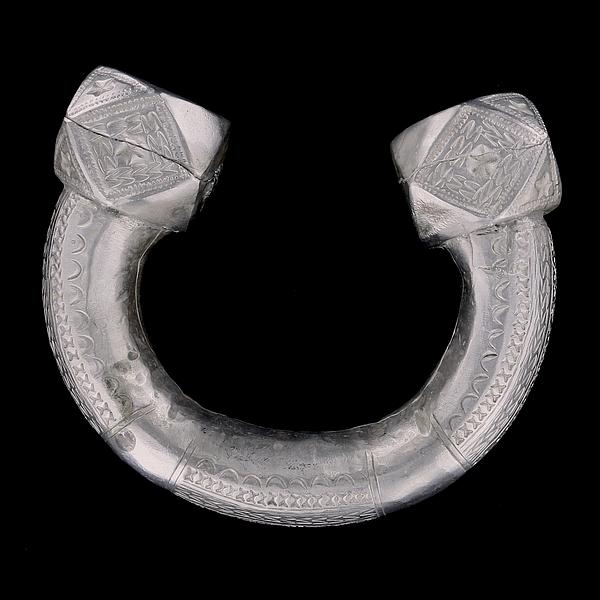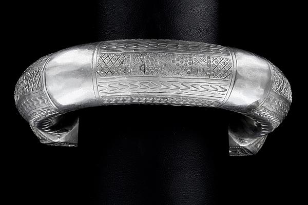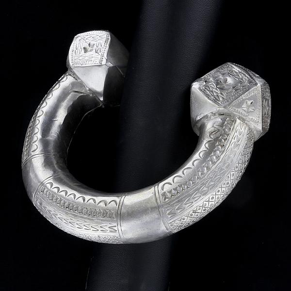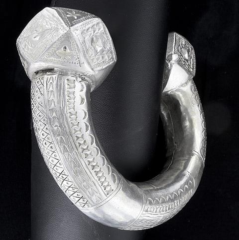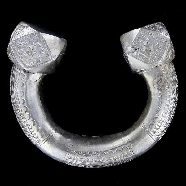 The bridegroom presents these anklets to his future wife during the wedding ceremonies. This sign, which affirms her marital status, will never leave her. These anklets can be hollow or solid and are decorated with punching and engraving. Because they are meant to identify the wearer's ethnic group, this jewellery is often very large in order to be recognised from afar. The fish motif is an important symbol used in the jewellery. Fish, which are symbol of fertility, also represent protection against the evil eye. The crescent moon, which is the emblem of Islam, is often associated with the star. The triangle and the circle are the most frequently used geometric shapes. The triangle deflects the evil eye, and the circle evokes the wish for a lasting marriage. (cit. World Jewellery Museum) Though meant traditionally as an anklet, you can also wear it as a bracelet.