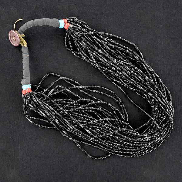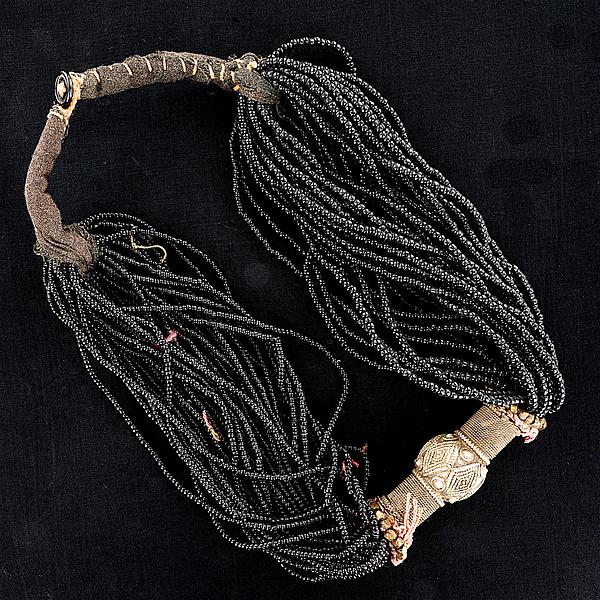 A large “tilhari” wedding necklace that used to be fashionable among most Middle Hill groups, especially the Tamang, Gurung, and Kiranti. Currently, Nepali women from these ethnic groups wear a smaller version in gold, if they can afford it. The "tilhari" is a primary emblem of married women. The wearing of this necklace symbolizes the wish for a long life of the husband.