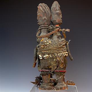 The present funeral statue, waka, less eroded than the two other ones in our gallery, is a double-faced pole. A male representation with its sexual attributes and bearing a kalicha, the phalic symbol of the Konso, on his forehead. The back side of the pole represents a women figure, probably the wive of the warrior celebrated by the pole. The pole comes with its wooden base. A rare example of a Konso pole in estonishing good condition.