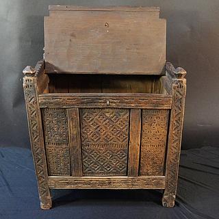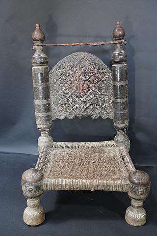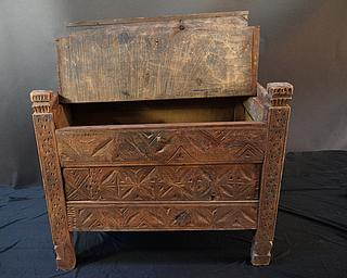 Timber was plentiful in the wooded mountains of the Hindu Kushvovered by Himalayan cedar trees. The culture of the Pathans in the upper Swat Valley was, until a few years ago, decidedly a 'culture of wood: mosques, houses and boxes, coffers, beds and everything, including the smallest spoon, was produced in wood. The most favoured timber was Himalayan cedar, because of its resilience, strength and its pleasant smell. Other commonly used woods are evergreen oak and walnut. Unlike their counterparts in neighbouring cultures the woodworkers in Swat valley, as in Nuristan, occupied a respectable middle position as craftsmen in the hierarchical Pathan society. Most of the skilled woodworkers and carvers are full-time craftsmen. According to Lühe, a specific division of labour has also developed. While coarse work (beams, boards, doors, etc.) were done by one group a second group specialised in turning the legs of beds, tables and chairs and the production of wooden vessels. A third group did the carving. Many of the motifs used in Swat Valley wood carving are derived from symbols whose roots can probably be traced back to prehistoric times. Two main reasons led to the disappearance of the "wood-culture". First the deforestation and second the fact that mountain villages moved down close to the tared main roads where the houses were built in concrete. Kalt reports that in 1988 they were no more skilled carvers in the villages he visited. All of Swat valley items have been bought during my two trips to the Swat valley in 2000 and 2003.