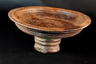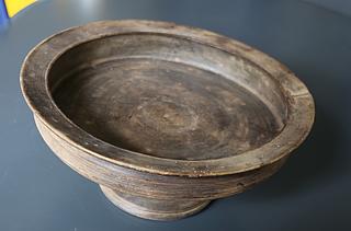 A one-piece round fruit dish, with a turned base. It has nice decorations party, vanished by prolonged use, and some traditional repairs which contribute to the attractiveness of this item. The dish was acquired in Swat Valley (Northern Pakistan).