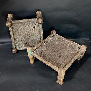 These are the simplest seats, 4 turned legs and a leather webbing woven in various geometric patterns. One seat has a hole in the leather webbing, see picture.