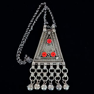 The triangular necklace called "Màkhnak", meaning "The pearl of the neck" is made up of a large central bead called in Rustaq area "al bursa", unripe date. On either side of the central bead are two red beads coated with silver. The horizontal rod is attached to two elaborate triangular shaped and articulated pieces of small silver balls and in-between them six fine meshed silver chains. The "Makhnak" necklace was a basic piece of every Omani women in Northern Oman.