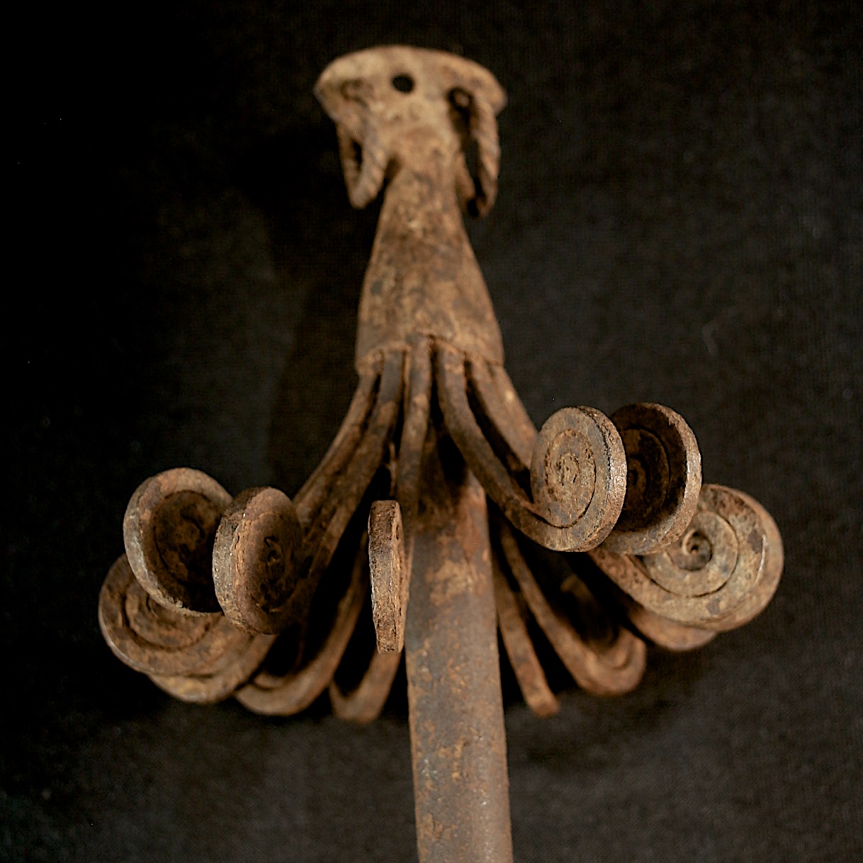 Origin of object unknown, any complementary information is welcomed on my mailbox. The crown with its spiraled end looks like some Kirdi / Matakam currencies. the pole is in perfect condition and mounted on a stand could be a nice design item.